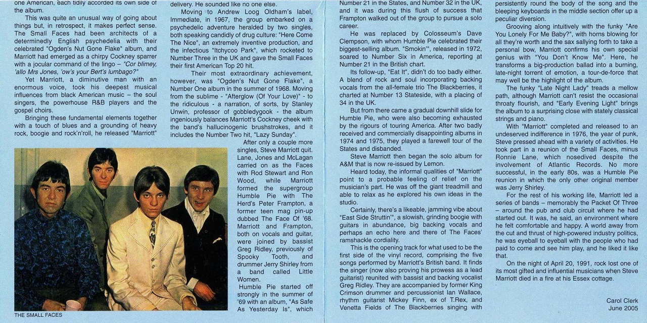 Steve Marriott (1947-1991) was a successful and versatile English blue-eyed soul, singer-songwriter and guitarist. He is best remembered for his uniquely powerful voice and aggressive guitar in groups Small Faces (1965-1969) and Humble Pie (1969-1975). In England, Marriott became a popular often photographed mod style icon through his role as lead singer and guitarist with the Small Faces in the mid to late sixties. Marriott's music was influenced from an early age by his heroes Buddy Holly, Booker T & the MG's, Ray Charles, Otis Redding, Muddy Waters, Bobby Bland and later the Rolling Stones. Marriott posthumously received an Ivor Novello Award in 1996 for his Outstanding Contribution to British Music and listed in Mojo magazine (sister magazine to Q) as one of the top 100 greatest singers of all time. His song "Cocaine" from his Steve Marriott's Scrubbers album is featured in the soundtrack of the video game Grand Theft Auto IV in the fictitious radio station Liberty Rock Radio 97.8.